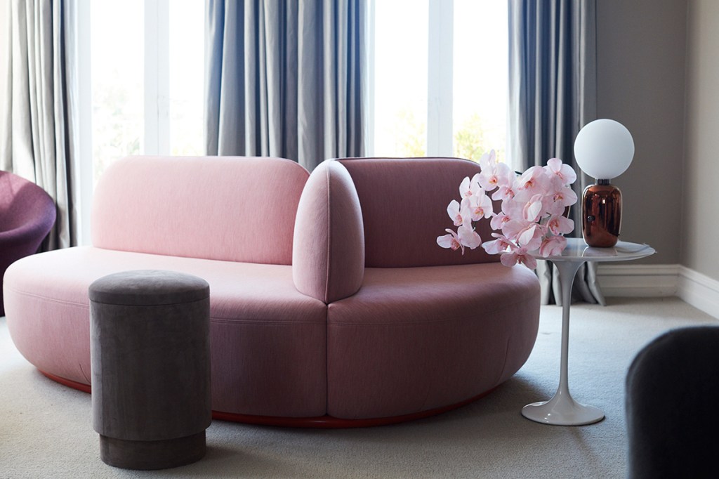 When furnishing the living room, it is advisable to focus on the main piece of furniture: the sofa. The combination of a pink sofa with a light marble coffee table and poufs covered in velvet will make the relaxation area really comfortable.