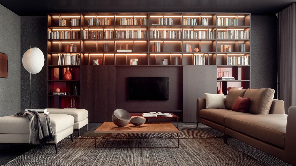 Modular furniture and systems become protagonists in the organisation of rooms. They are part of the architecture, integrating new compositional possibilities that envelop existing architecture, such as the fireplace, or provide new integrated functions such as the bar and home office.