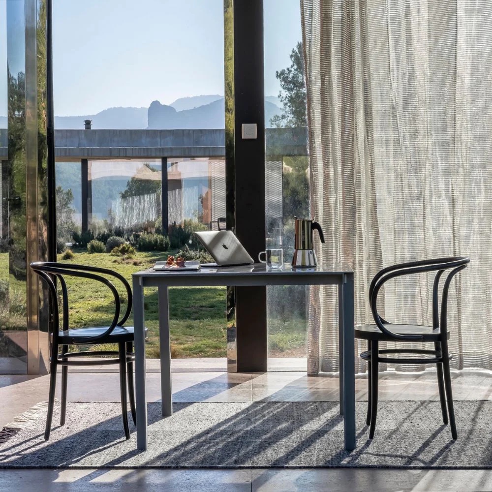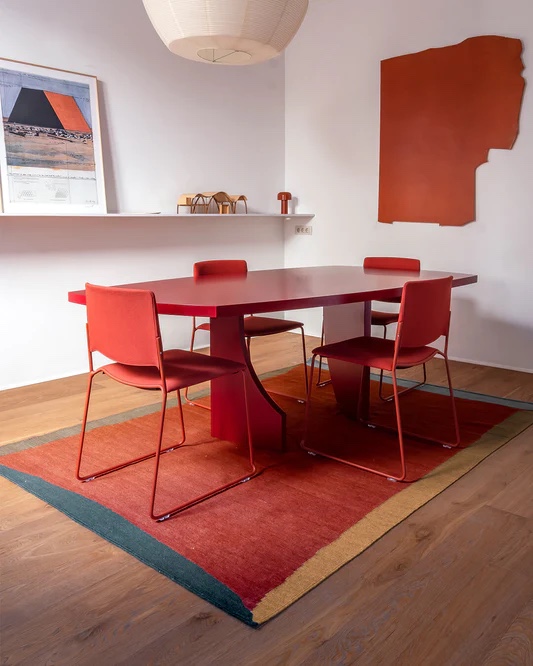 The theme of colour must be confronted above all with the combination of carpet and floor because this is the contrast that must emerge to give that feeling of space defined by the fabric. The relationship with chairs and table, on the other hand, can be played with a combination of classic and modern lines, for example by focusing on the traditional patterns of a kilim and the essential, contemporary lines of the furniture.