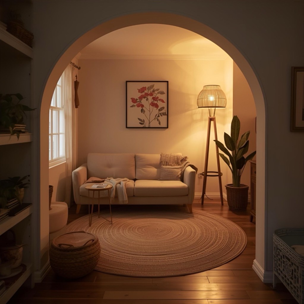 In a small living room, you want to define specific areas (like a seating zone) without creating visual barriers that make the room feel fragmented. A rectangular rug can sometimes feel like it’s “chopping up” the floor plan.